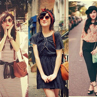 Exemplo de roupas do estilo vintage são vestidos e peças de estampa poá (bolinhas). Mini saias ou vestidos curtos com bota de cano longo. Os óculos estilo gatinha, e os redondos também são vintage.